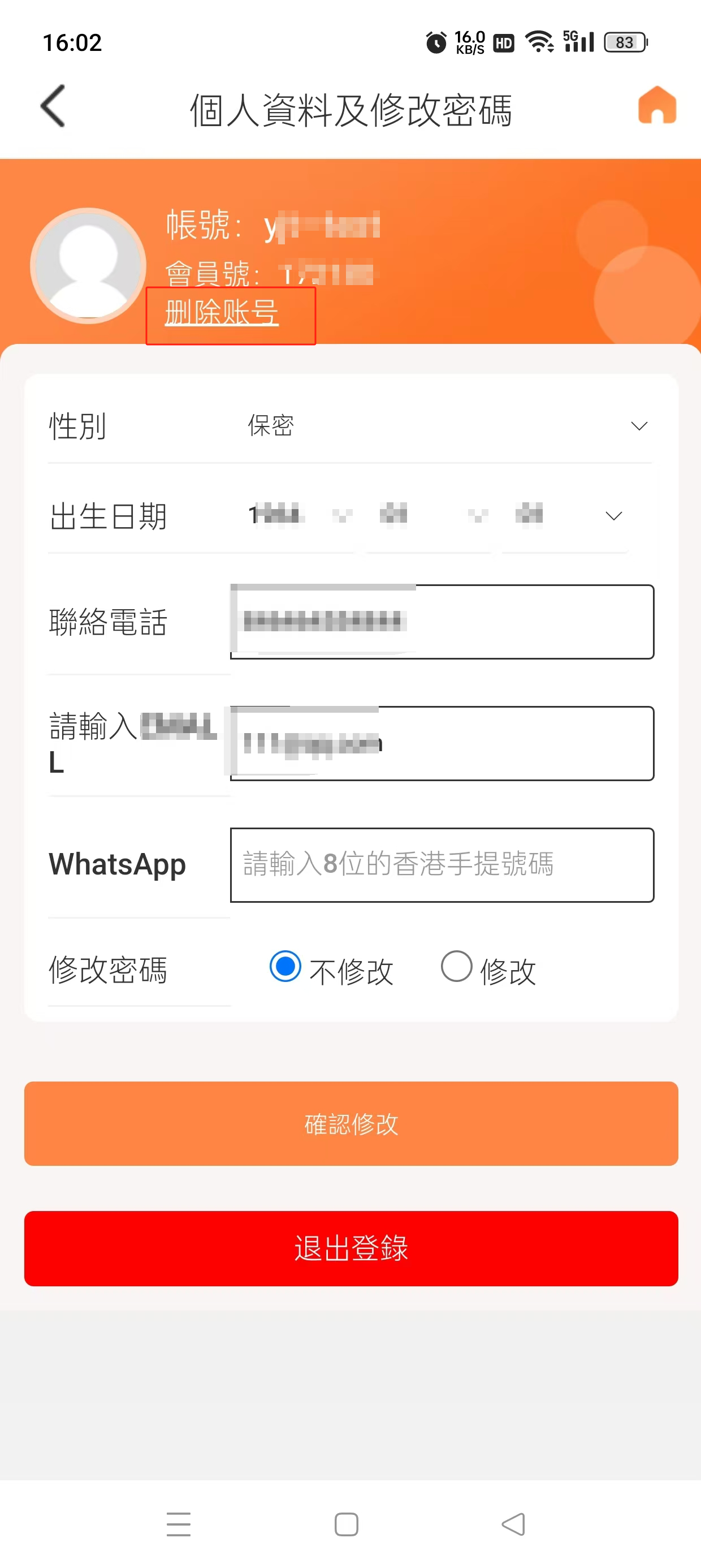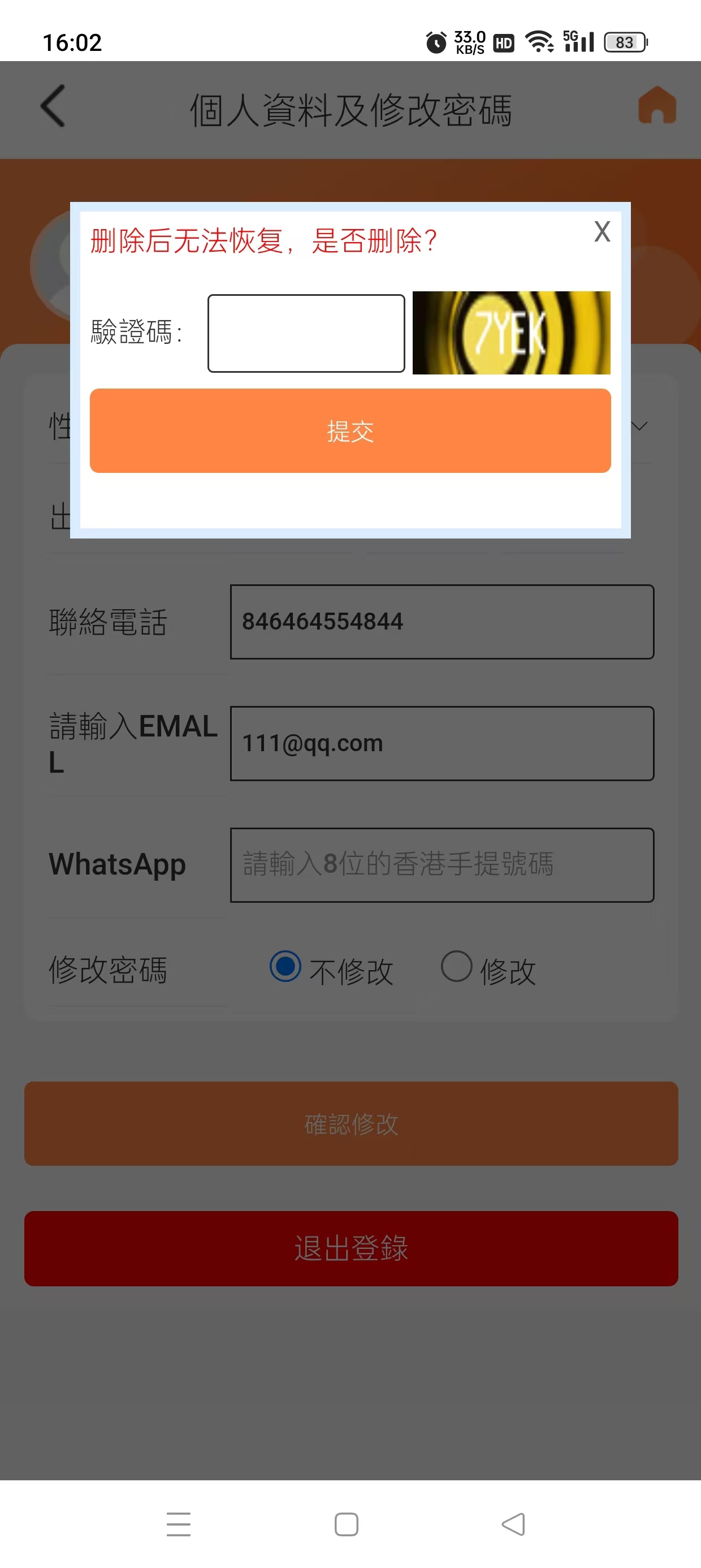 為確保會員不因誤操作而意外遺失帳號,系統在點擊“删除帳號”按鈕後,將彈出確認提示資訊,並要求會員輸入圖形驗證碼進行二次確認。 請會員在進行此操作前務必慎重考慮,一旦確認删除,該操作將不可逆轉,帳號數據將被永久移除。 此後,會員將無法再使用已删除的帳號登入本應用程序,同時,會員在本應用程序中所有保留的資訊也將被全部删除。